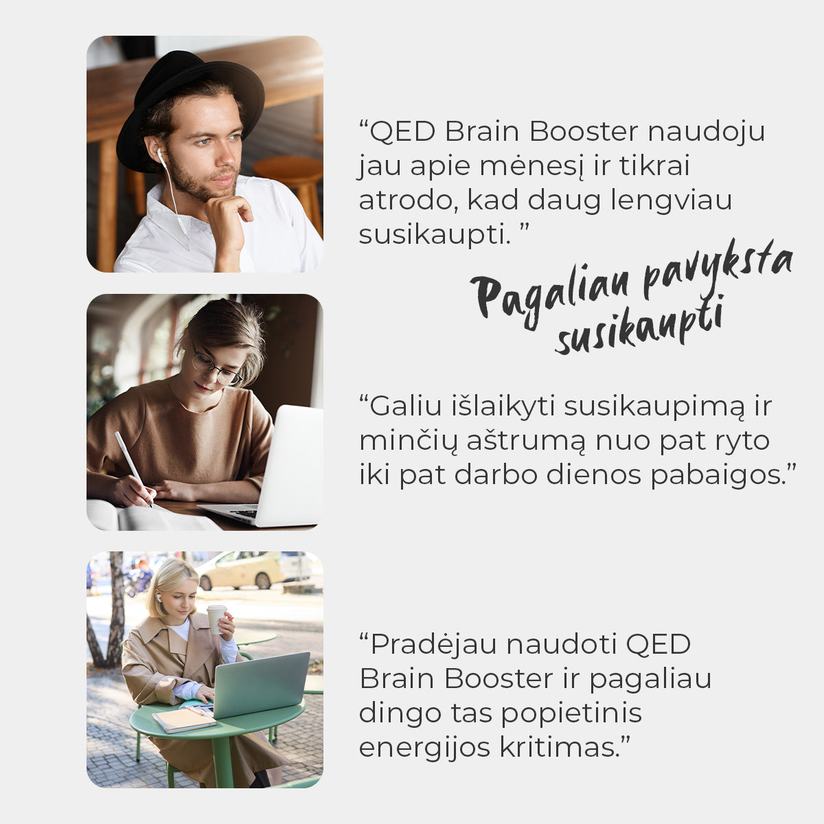 „Man padeda išlaikyti tolygų tempą visą dieną – tapo kur kas lengviau išlaikyti dėmesį ir nuosekliai susikaupti ties svarbiausiomis užduotimis.“ – Miglė, QED bendruomenės narė