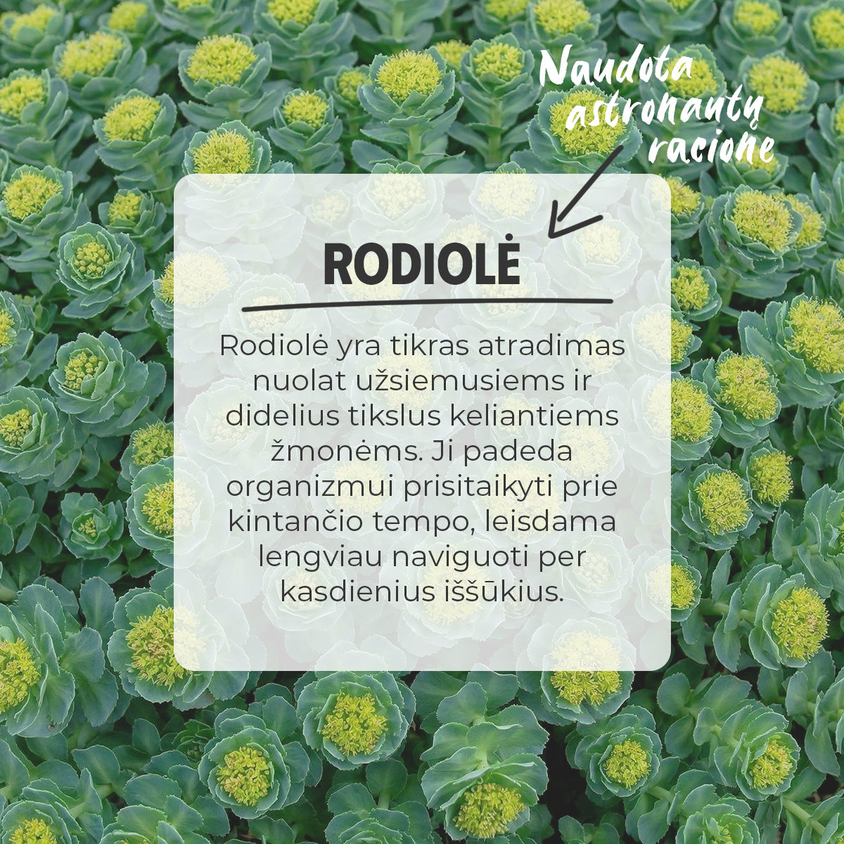 Rausvoji rodiolė (Rhodiola rosea) – padeda palaikyti nervų sistemos veiklą, psichologinę funkciją ir organizmo ištvermę; vertinama dėl savybės padėti prisitaikyti prie aktyvaus gyvenimo tempo iššūkių.*