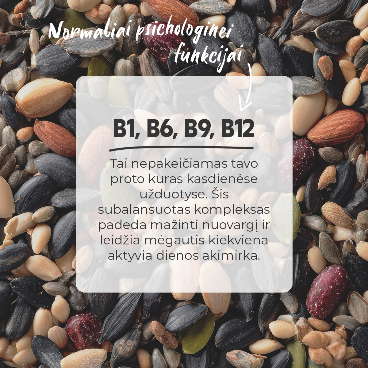 B grupės vitaminų kompleksas – prisideda prie normalios energijos apykaitos ir nervų sistemos veiklos palaikymo