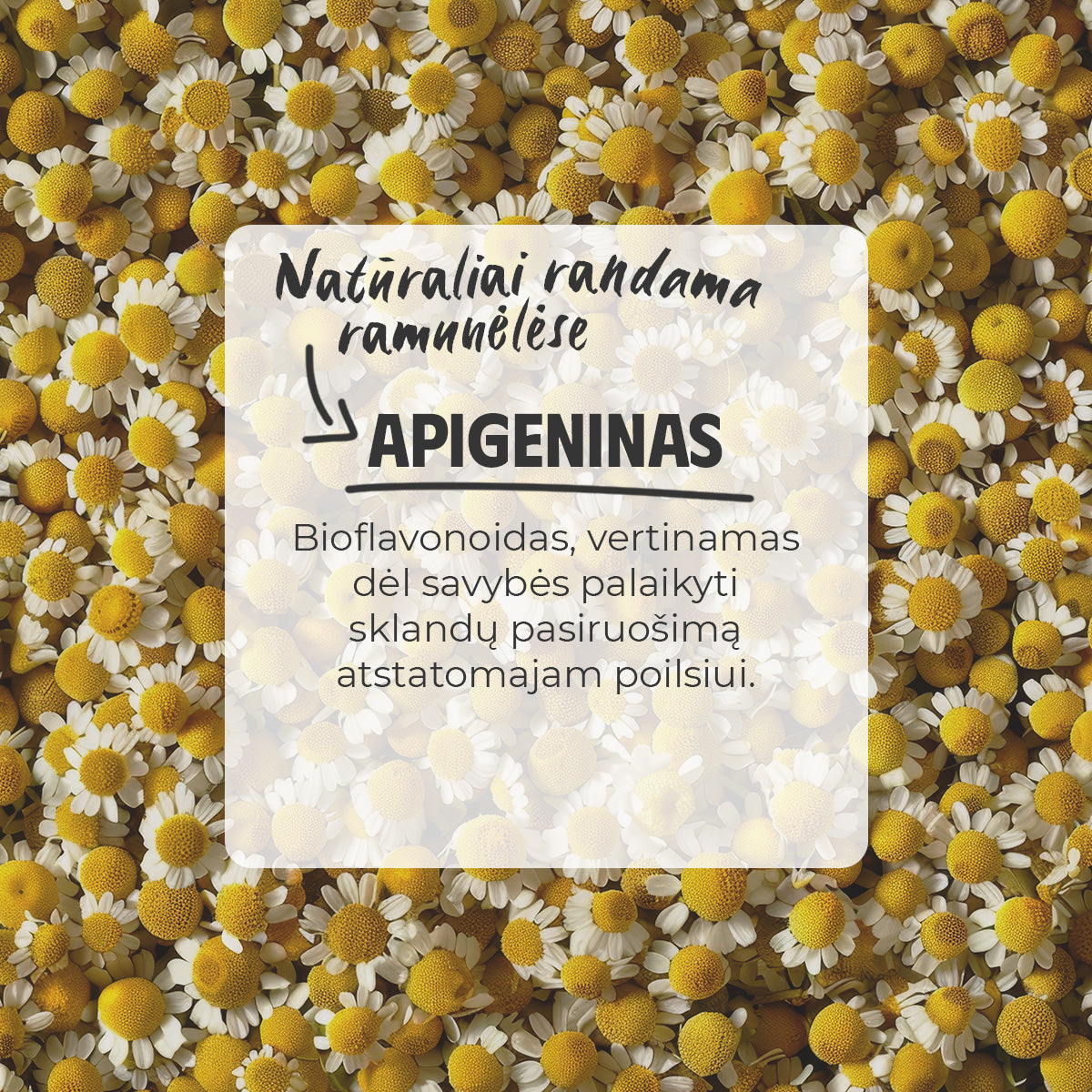 - Apigeninas (98% standartizuotas ramunėlių ekstraktas) – bioflavonoidas, natūraliai randamas ramunėlėse (Matricaria recutita L.), vertinamas dėl savybės palaikyti sklandų pasiruošimą atstatomajam poilsiui.